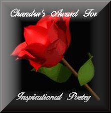 CHANDRA'S ANGELIC AWARD, CHANDRA'S AWARD FOR INSPIRATIONAL POETRY, & CHANDRA'S TOP SITE FOR THE DAY AWARD: (Received on 2nd June 1999) Faye-Linda McGovern wrote: "I had a chance to browse your web site this afternoon and I am very impressed. I would hate to try to guess how many hours you have put into it. You have done a fantastic job! Therefore, it gives me great pleasure in awarding your web site with not one award, but THREE awards!! Congratulations on your achievement and keep up the good work!" Thanks a ton Faye-Linda, for these great awards. I am really privileged to have them and also to hear these good wishes from you. |