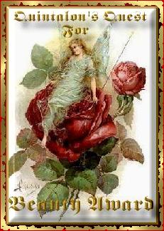 QUINTALON'S QUEST FOR BEAUTY AWARD: (Received on 1st June 1999) Quintalon wrote to me:" I took a tour of your site and thought it was great. Keep up the good work". Thank you so much Quintalon, for this beautiful award. I feel privileged for receiving your award. |