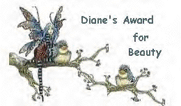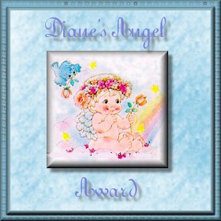 DIANE'S ANGEL AWARD, DIANE'S AWARD FOR BEAUTY: (Received on 2nd June 1999)Diane wrote to me:" I really liked your site. There were some profound things said there. I totally agree with you. We need to change ourselves and be a peace with us and have a good and positive attitude, then maybe we could help someone else." Thanks a ton Diane for these adorable awards and heartening words. These would remain a treasure for me and yes, I hope and pray that I would be spread this good thoughts on happiness, peace and positive thoughts to all, whom I come across. |