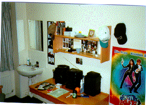 Here it is... the place I call home for the year. It's much like a dorm room, and in essence I am repeating my freshman year in Santa Cruz dorms all over again. Although, this time there's no KP2300's to speak of. Although, I do get along well with my flatmates. Jos is from Shrewsbury, Kevin from Manchester (home of Oasis), Nick is from Harrogate (just outside Leeds) and Phil is from Tunbridge-Wells in the south. We all share a common kitchen and shower and bathroom and we all get along alright, thank god. Enjoy the little peep show into my world.