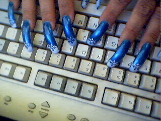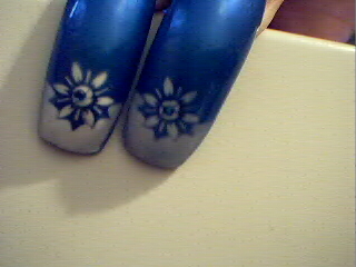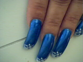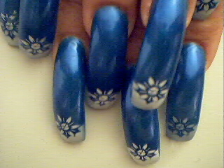 Here is some art I really like. I do like to wear blue and the design is nice with the white flower on the tip. I will have more pictures very soon. Hope you enjoy.