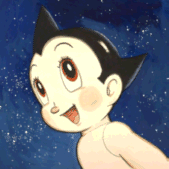 This is the Japanes Super Hero and crime fighter Tetsuwan Atom which (roughly translated) means "Iron-arm Atom". In English he's called either Mighty Atom or Astro Boy. He was created by Osameu Tezuka and is probably the most popular cartoon figure ever in Japan. He made his first appeared in a boy's magazine in 1952 and the actual tv episodes ran from 1963 through to 1966. The Super Hero has seven different powers and a strong sense of justice with which he defends society from threats posed by humans, robots and even alien villains.