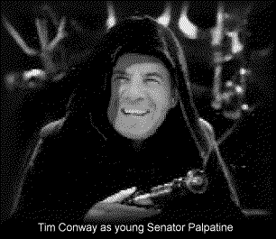 shouted "Dorf!" and left the room. The casting director took Lucas's decisive utterance to mean that he wanted the star of the mildly successful series of direct-mail-order "Dorf" comedy videos (such as Dorf On Golf and Dorf Goes Fishing), veteran TV funnyman Tim Conway. As it turned out, Lucas was merely choking back the attempted escape of his lunch (his usual half-dozen bacon 'n' sour cream Gorditas from the corner Taco Bell), and had made a fast exit for the nearest restroom. However, before the miscommunication was discovered, Conway had been cast, and the crew had finished shooting two-thirds of the Palpatine scenes (with Conway shuffling around on his shoe-clad knees, squinting and bumping into things). |