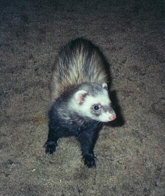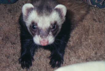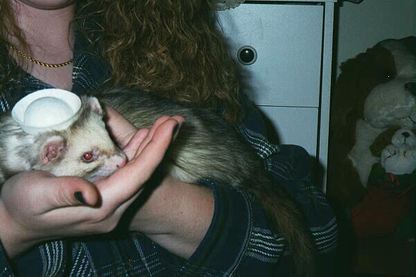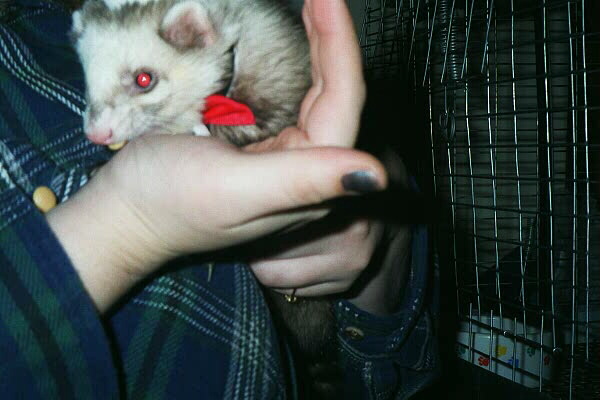 Even ferrets get red-eye! This is Plinko again with a peanut butter treat in his mouth and with a cute red bow.