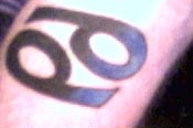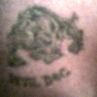 Skull with tophat on my right upper arm, tribal mask on right forearm, women holding a snake on my right forearm (outside),skull on right of chest, bulldog on left of chest, my last name across my stomach, a skull with horned helmet on my left arm, playboy bunny on the right side of my back, and my birth sign on my leg. |