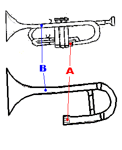 Here, I have simply sketched out the necesary section of the trombne in approximately correct proportion to the trumpet. The markers A and B show the points where the bells would be attached on each of the horns.