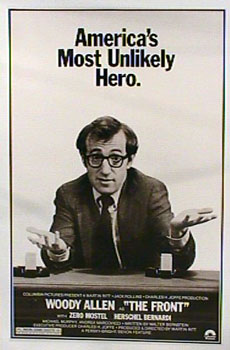 In 1976, Woody Allen stepped in front of the cameras for director Martin Ritt as the main star in his film, The Front. A good, if slightly overlong exploration of the infamous Hollywood communist black-listing, the film focuses on Allen's character, a non-writer who "fronts" for black-listed film writers. It was a practice that actually occurred during the McCarthy Era in the United States; whenever blacklisted screenwriters wanted to continue working in the industry they would hire a "front", or assume a psudeonym.
