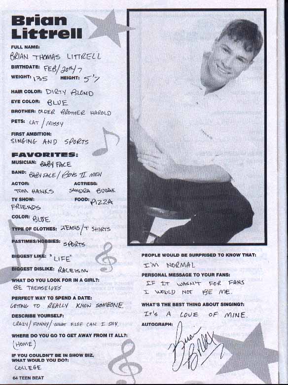 Backstreet Boys is Brian Littrell's first big showbiz gig. He spent his growing up years singing at his local church, and was frequently invited to perform at other regional churches, revivals and weddings. To balance out the picture, Brian immersed himself in popular music at school, and his fascination with artists such as Hammer and Boyz ll Men kept his ears firmly tuned to Top 40 and Urban radio stations. Brian enjoys his life and considers himself very lucky to be a member of the Backstreet Boys.