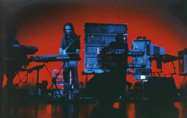 James Goddard (invisible at left), Rob Jenkins (with guitar) and Mark Shreeve (at Moog) of Redshift.