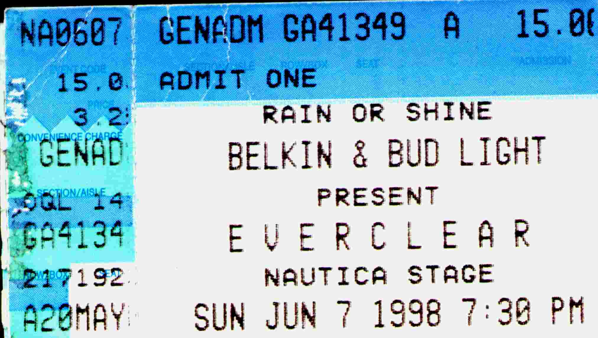 Everclear is truly awesome. the one thing that got me hooked on them so bad is that i went to their concert in cleveland on june 7'th 1998 at nautica stage. the show started off with a little fastball. they were good. not as good as i expected, but good. then marcy playground came on. before then, the only marcy playground songs i had heard were of course the little pop song and a little from the cd. even though i knew nothingof them, they were still awesome. they really got the party started with the mosh pits and crowd surfing. then after they were done, the stage was empty for a good half hour or so. the touring accordian player stepped out of the darkness with a spotlight on him. he started playing a little tune. then art stepped out from behind the stage and him and the accordian player did an intro of santa monica. as soon as they were done, the recording for so much for the afterglow started playing. everyone went nuts. when the time came for the band to step out of the darkness, the feed back started and then the place blew up!!! all i saw were white men in balck suits. from there on it was the coolest thing i have ever seen. they were so good onstage, had the right tone, and of course art's facial expressions when he sings topped the whole thing off. it was the craziest party i have ever seen. the one problem about the whole concert was that people kept throwing things at the band. beer, coins, clothes, and a whole lot of beer got thrown. who would have that much disrespect to throw things at them? the guys did a set consisting of about every song from so much for the afterglow, then went to sparkle and fade and then a little of world of noise. during everything to everyone, a GIANT ship came by, honking his big ol' horn, and blurring the song. i could tell they were playing it, but i could not pick out the tune. towards the end, they started going offstage. they stayed off for a couple minutes and then came right back on playing a few encores and on the last song, a couple lucky people from the crowd got to actually go up onstage and dance with the band. it was truly the best show i have ever seen.