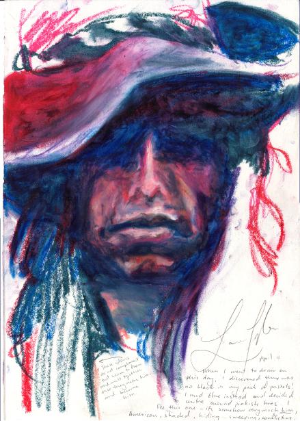 Just an experiment. I do not think his face is very right but I like the colours and how everything blended. Mostly for me this kind of colour scheme has to be spontaneous and momentarily inspired - I can't do it on purpose. This one has a kind of brooding feeling, probably because you can't see his eyes. I didn't have a black, that's how the colours came about.