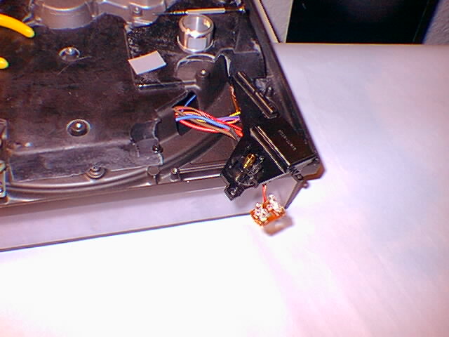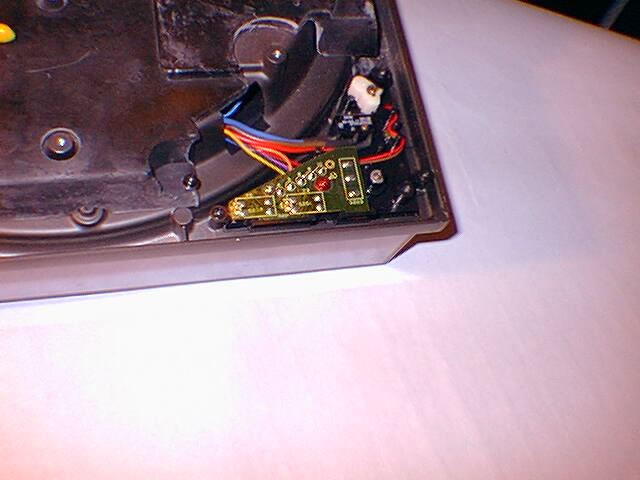Once you have the bottom removed you will need to shift your attention to the bottom right corner of the turntable. This is where the circuit board is that contians the power and 33/45 switches. There is 4 screws holding the circuit board down, they are all the same color (black). 3 of the screws are at each corner and the the fourth is in the center. There is only one other screw (this one is usually a different color like broze or silver), you can remove that as well, or wait until later on, but it does not have to be removed to get the circuit board removed. Once the screws are removed carefully pull the circuit board out, do not pull too hard as it is attached still by some wiring which we are going to leave attached. Once you have it out, flip it over and have a look. You will see the power switch. We need to get that cover off.