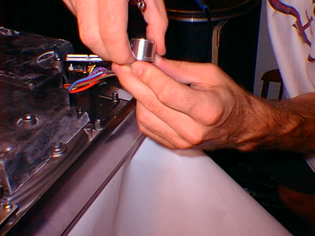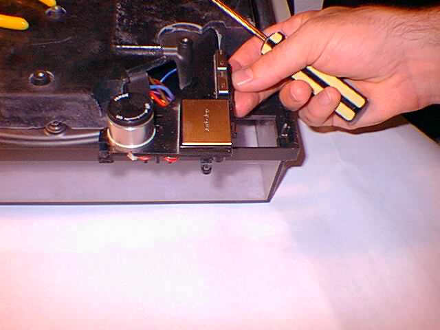 Remove the rubber bottom of the turntable. This is done by removing all the screws, including the 4 screws under the four foot posts, and then the foot posts themeselves. You will need a Phillps #2 screwdriver for this. The foot posts come off by turning them counter clockwise. I usually leave the turntable upside down on its dust cover. REMEMBER TO REMOVE THE PLATTER, SECURE THE TONEARM, AND REMOVE THE 45 PLUG BEFORE YOU TURN IT OVER!!