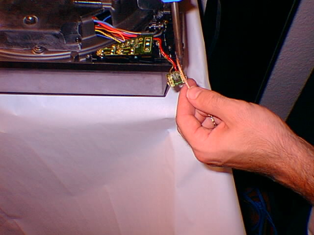 Remove the white filter. The wiring for the LEDs is wound around the circuit board. Unwind the wires and this will allow you to lift the LED board up off the main circuit board housing. You are going to remove each of the LEDs on this board. Place the LED board somewhere solid nearby (probably on the underside of the turntable. Remove the LEDs by using solder wick or a solder sucker. Using Solder wick is very simple. Hold the wick on the bottom side of the circuit board where the LED posts come through and are attached by the solder. Using the soldering iron, press the wick onto the solder joints until the solderheats up and is absorbed into the wick. Repeat the process for all the posts. When you go to pull the LEDs out heat up the posts a little, sometimes there is some solder residue left and can make it tricky getting them out.