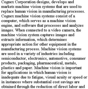 Business SummariesCognex I chose Cognex because it is my dad's company, and the stock has been doing pretty well lately. By investing in Cognex, I will be able to track the stock that we own. This company's web page is linked at the bottom of this page, and if you are an interested investor, I suggest you go visit. At Cognex, they make and sell products which are used in place of humans, making products more efficient and reliable. Ask Jeeves