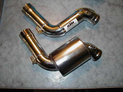 | KTM makes an S-pipe that replaces that resonator before the muffler. It is a PERFECT replacement fit, reusing the graphite gaskets, springs, and clip-nut. It weighs a bit less, and should keep the gas speeds up. I bought this pipe from KTM enthusiast Phil Mille in CT, who coincidentally has sold me a bunch of stuff back when I used to race a Hawk GT. I guess we have similar tastes in bikes. The S-pipe can be had for around $115 from KTM. | |
