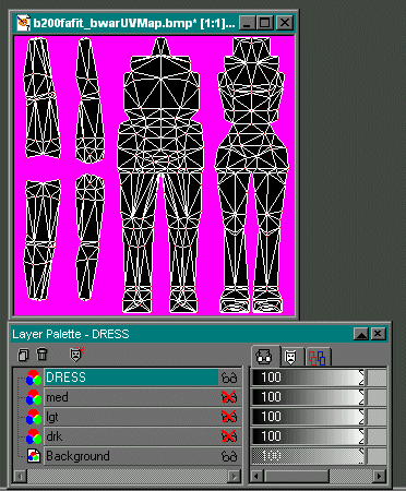 First, you need to make a Wire frame of the .skn file you want to make the skin for. For your convience I have included a wire frame for you to use, it comes with The Sims game.