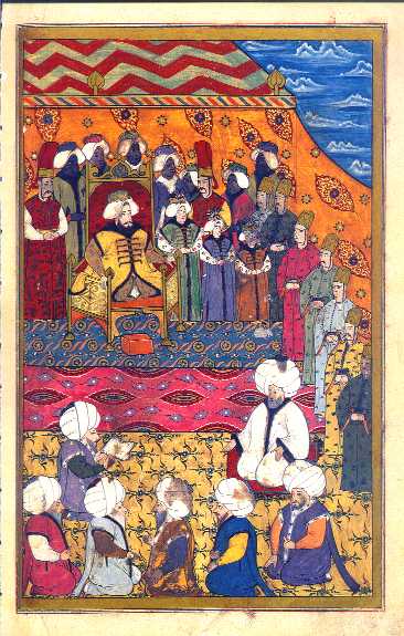 In this scene, the sheikulislam and other leaders of the Ulema are being received by the sultan in the council tent.