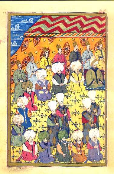 In (35a) we see still more members of the Ulema, some wearing green turbans. The grand vizier, dressed in a sable-lined cloak, is kneeling on a blue carpet at the right just above the center. A row of pages observes the proceedings in the background. The four figures standing in the lower right quarter of the frame are the sergeant-major and steward of the Doormen (in front) and the chief master of the Doormen and a master of the Doormen.