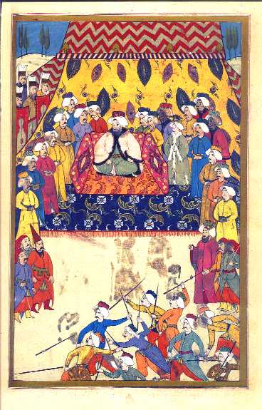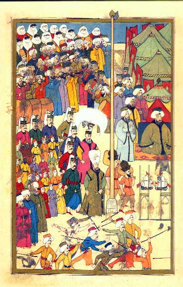 In this scene we see a burlesque jereed match being played before the sultan and grand vizier and the start of the procession of boys who will be circumcised.