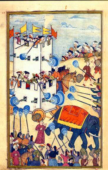 It stood there inert like an unshakable earthwork as massive as the Caucasus. Like soldiers in battle, fearless heroes from the Imperial Arsenal surrounded the fortress, their eyes fixed ardently upon it and ready to fight. They encircled that bright-cheeked fiery beauty like a belt encloses a waist and as they enveloped the skirt of the wall endeavoring to open the quite obstinate button in the collar of the sturdy door with the sharp point of the sword, the smoke from the guns and cannons fired from within the fortress shrouded its wall like a curtain so that they were unable to attain the happiness of even seeing the fortress much less gain entrance to it. Many times they lit the fire of war and combat and turned the festival-ground into the field of Judgment Day. But the battle-composition reached its coda with the refrain: