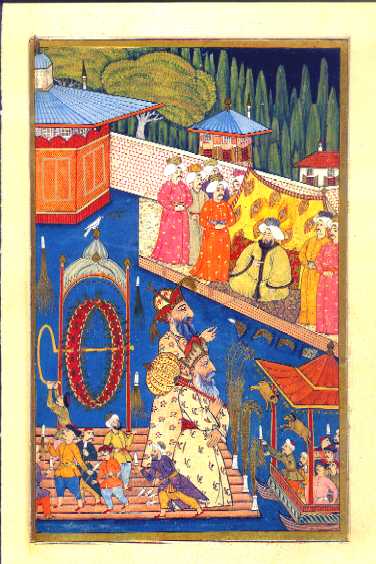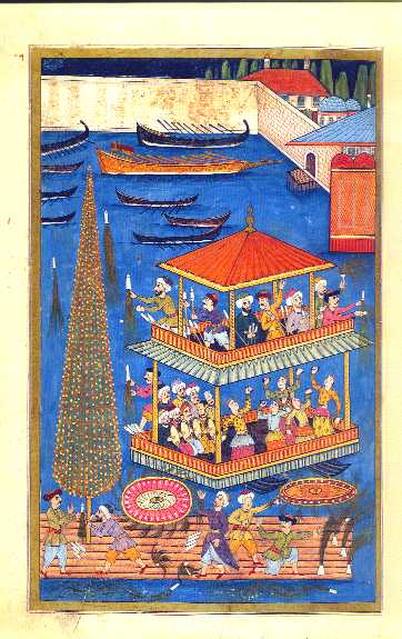 These images show events that took place before the Arsenal Palace on the Golden Horn on the evening of the third day. According to Vehbi, the sultan observed the performances from a tent set up on the quay before the entrance to the palace while the grand vizier watched them seated beneath a bower set upon on the admiral’s galleon anchored off Aynalıkavak pier. The sequence and details of the rafts described by Vehbi are different from those depicted by Levni. In (50b) we see the sultan seated in a tent on the Arsenal Palace quay surrounded by attendants. Two rafts are floating by. The one at the right, of which we can only see a part but appears to be a platform mounted on a pair of caiques, was donated by Yeğen Mehmed Pasha, Superintendent of the Customs Office. (According to Vehbi, this was the last float to appear in the procession. This knowledge and the stances of the figures in the two images indicate that the flotilla is moving from right to left.) Unlike the others it has a roof. The figures of two rams suspended on gears and pulleys from the roof butt one another. This is following a real raft on which are set two gigantic dummies that face backwards and are dressed in Persian garb. The parts of their bodies moved as if they were alive and they seemed to be playing with or worshipping fire, in the form of fireworks blazing before them. At the front of the raft is a huge wheel of fireworks that one of the pyrotechnists is causing to revolve. Its supporting frame is surmounted by a fire-spewing bird and rockets hurtle this way and that. The image at the left (51a) shows an earlier stage of the flotilla. A long raft in the foreground carries a huge structure shaped like a cypress tree from which strings of fireworks are suspended and two Catherine wheels. Rockets and projectiles hurtleabout. On the basis of Vehbi’s account, this should be the float prepared by the Artillerymen’s corps. A two-story structure set on a pair of caiques carries a troupe of dancers and musicians on the lower floor while pyrotechnists are busy at work on the upper one. This is probably the float prepared by the Arsenal corps, which Vehbi describes as a "high-domed kiosk". In the background of this frame we can see a golden imperial barge lying among more modest caiques. A latticed pavilion with a pale blue (lead) roof provides an architectural link between the two images.