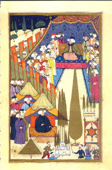 Levni shows this evening’s fireworks displays, which are described in elaborate detail by Vehbi, as taking place beneath a starry sky and a crescent moon. In (100b) Ahmed III is seated in his pavilion with İbrahim Pasha outside in their customary positions. In the foreground, pyrotechnists scurry about as they tend the fireworks: a cypress tree, a fountain, a tent, four ewers, and a Solomon’s seal all spouting brilliant cascades of golden fire. In (101a), another tent-firework is ablaze in the upper right as skyrockets hurtle upwards and left and right. Just right of center is another figure garbed in fireworks. According to Vehbi, this performance was staged by members of the Engineers corps. He was dressed in a "cloak" fashioned from fireworks. (The rectangular frame around his neck on which more fireworks are set may be a safety device. Also compare the "executed" bread-seller in (