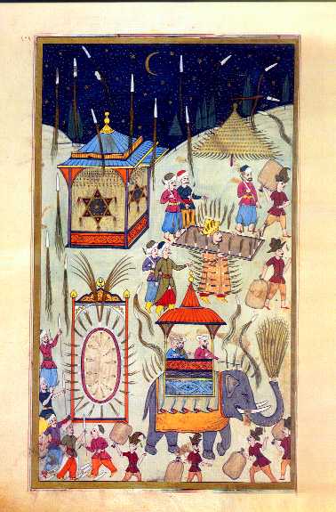 73a) and the simit-seller in the upper right quarter of (76a).) As he passed before the sultan, the hem of his robe was ignited and he suddenly burst into flame and began running this way and that. The mechanical elephant in the foreground is another work by the Arsenal corps. It is being operated by three corpsmen seated in a howdah on the beast’s back. As this contraption marched around the field it continuously spouted fireworks from its trunk. Behind the elephant is a fireworks display fashioned like a water-wheel from whose buckets pour sparks instead of water.Return to