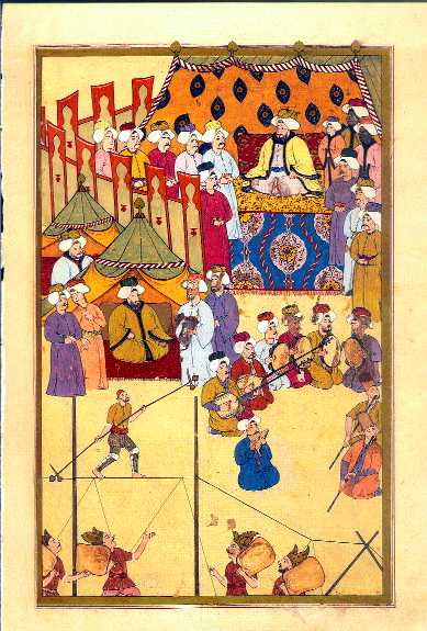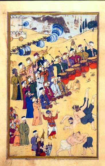 In (115b) the sultan and grand vizier are watching performances by musicians and singers. A tightrope walker strides across the foreground of the frame as sackers look up and comment. In (116a) two pairs of wrestlers grapple as a large military band thunders out its music. At the bottom just left of center, a prestidigitator kneeling before a mat performs tricks. At the left edge, the day’s contingent of boys headed for the circumcisers enters the frame. The inclusion of the revolving fortress and cannons in the upper left corner is a reminder by the artist that cannons were fired to mark the arrival and departure of the sultan and the times of day throughout the festival.