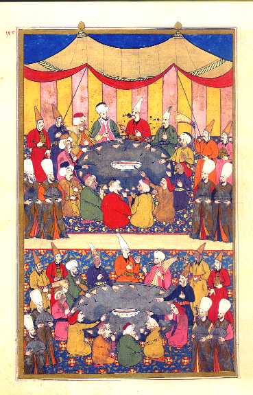 The banquet on the ninth day of the festival was for the leaders of the Bostanji corps and of other corps in the personal service of the sultan. In (122b) the first table is presided over by Governor Ali Pasha of Raqqa with the first and second masters of the Horse seated to his left. To his right are the three chiefs of the sultan’s Falconers and Hawkers. The seventh guest at the table, dressed in a pink kaftan, must be the chief of the Bostanji corps. The second table in the foreground is occupied (according to Vehbi) by Governor İbrahim Pasha of Maraş, Tevkii Mustafa Pasha, and the chief of the Exchequer along with superintendent of the Barley Office, the chief Armorer, and the two ranking officers of the Household Cavalry. In (123a) we see two more tables set up in the smaller guest tent. On the basis of their costumes, these must be lower-ranking officers of the Bostanji and Privy Stables corps.