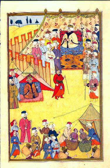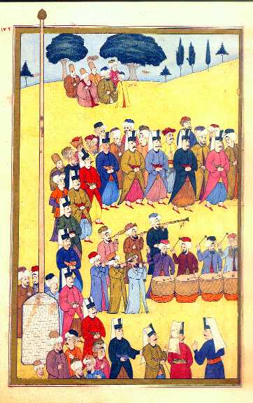 ahin and his assistant Hajji Mehmed are back again for the last time. For their final act, each is bound hand and foot and then put into separate baskets, one yellow the other green. The baskets are closed and securely tied with ropes to keep their lids from opening. The baskets are then set in a tent, which we see near the lower right corner of (131b). Guards are stationed around the tent to keep anyone from entering. After fifteen minutes the tent is lifted away and the audience sees that the baskets are standing where they had been left. The lids are untied and out pop Şahin and Mehmed: not only are their hands and feet free but each is now in the other’s basket. In (132a) Levni depicts a military band playing music while the Egyptians perform. A line of white capped janissaries stands around the field while spectators look on. The silver vessel full of coins that was placed at the top of the mast at the left with such great difficulty in (84a) is gone. According to Vehbi, the silver vessel was brought down in a competition on this, the tenth day of the festival (October 2nd), the last day of the proceedings at Okmeydanı before the court returned to Topkapı Sarayı and everything on the festival-ground was dismantled and hauled away.Return to