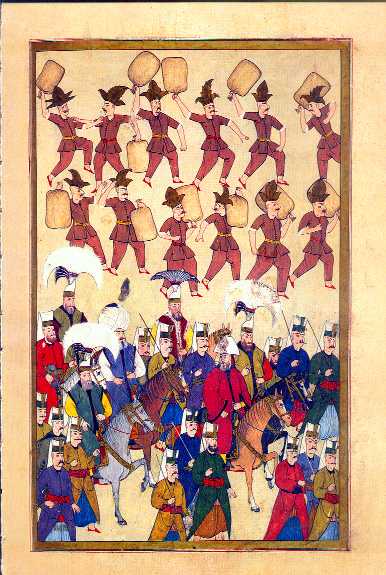 The festival that began on Wednesday, September 18th 1720 lasted fifteen days in all, during which time feasts were held, performances were given, guildsmen marched, and several thousand boys were circumcised at the court’s expense. On the last day of the festival Vehbi tells us that there was a game of jereed, a horse race, a feast, and the competition to reach the silver vessel filled with coins on the mast. Levni does not depict any of the events that took place during the last five days. After the festival was over, all the tents and other structures in Okmeydanı were dismantled and removed and on Wednesday, October 2nd, the court returned to Topkapı Palace where preparations for the last events were already in progress. Between October 4th and 8th more there was more entertainment and performances and another 532 boys were circumcised. Now it was time for a great parade in which the candy-gardens and festival-trees would be transported from Eski Saray to Topkapı before the sultan’s own sons were circumcised. Levni now returns with sixteen double-page miniatures depicting this parade in a long, unbroken frieze.