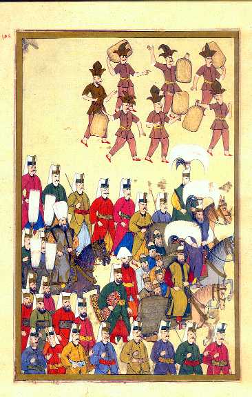 In (157b) janissaries in the lead clear the way for the chief of police and captain of the guard who are followed by the Janissary master (the turbaned figure in a blue robe) and the keeper of the hounds at his right. The figure sporting a huge white plume with a black aigrette at the left edge is the İstanbul agha. In (158a) three white-plumed Janissary aghas are followed by the Janissary grandmaster dressed in a tall turban and patterned silk kaftan. The procession is flanked on either side by lines of marching janissaries. A large contingent of sackers engaged in various antics marches across the top of both frames.