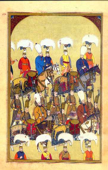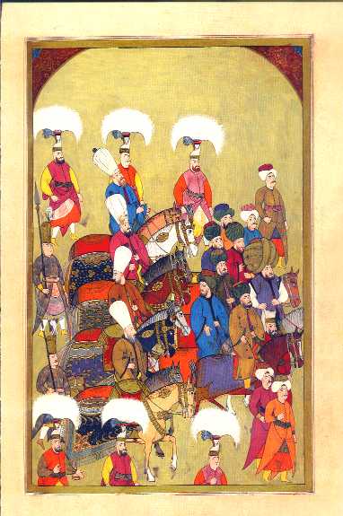 At the far right of (167b), Mehmed Zeynelabidin Efendi, Chief of the Descendants of the Prophet, leads the way on horseback dressed in a huge green turban and followed by a number of seyyids also wearing green turbans. The three white-turbaned horsemen are officers of the Privy Stables and they are accompanying four of the eight spares brought for the procession. The remaining four appear in (168a) in a different composition that includes a guard of solaks and peyks. The horses in this scene have what must be leopard or tiger skins draped over the saddle-cloths at their rumps.