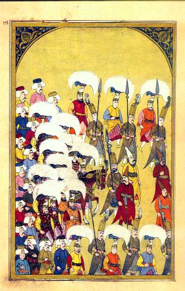 Sultan Ahmed III reappears seated in the upper part of (168b). According to Vehbi, when the parade set out from Eski Saray, the sultan left Topkapı Palace and went to a building that served as the studio of the court’s artists and was located on the parade’s route. It was from here that he watched the progress of the parade. The ninth of the procession’s spare horses appears in the lower right quarter of the frame. In (169a) Prince Süleyman is all but lost in a sea of men and horses surrounding him, appearing just slightly left of the center of the frame dressed in a red kaftan with gold frogs.Notes