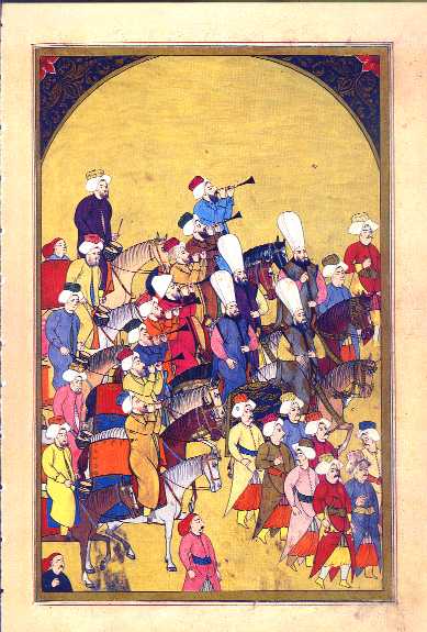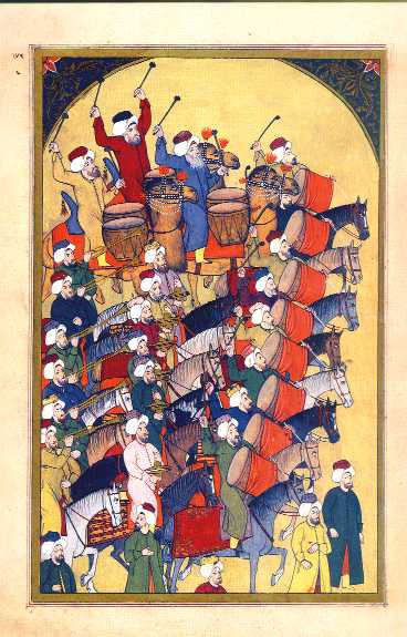 In the right frame (171b) of this, the penultimate scene of the great parade, four horsemen (probably the officers of the Mehter, the famous Ottoman military band) lead the way. The two in front are dressed in patterned silk kaftans–an indication of their higher rank. They are followed by a line of eight zurna-players and another line of five musicians playing small double kettledrums. At the far right of the second frame (172a) eight musicians are beating the huge base drums called davul. They are followed by a line of six cymbal-players with a line of six trumpet-players bringing up the rear. All of these musicians are mounted on horses. At the top of the scene, three more musicians are having at three pairs of large double kettledrums mounted on the backs of three very jaded-looking camels.