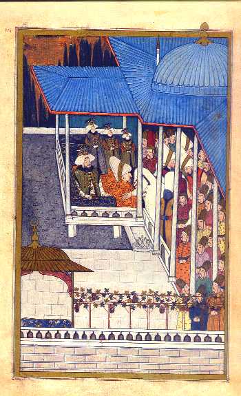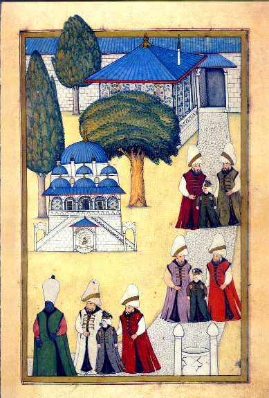 Palace, there were still more ceremonies and feasts. At length, the great throng of invitees dispersed and departed. In the early afternoon, a more intimate group of officials gathered. After a number of ceremonies, they were received by the sultan in the Chamber of the Sacred Mantle. In the late afternoon, the boys were circumcised in the Circumcision Chamber.In (173b) we see the three princes being conducted to the Circumcision Chamber. Leading the little procession is the chief of the Black Eunuchs. The oldest prince, Süleyman is being escorted by Grand Vizier İbrahim Pasha and by another vizier (probably Tevkii Mustafa Pasha). They are followed by the other two princes, similarly escorted by viziers. The building in the upper left quarter of the frame is the Library of Ahmed III, built in 1718. The building in the background is the Throne Room and to the right of it is the gateway leading from the Harem to the Third Courtyard. In (174a) we see another ceremony. The sultan and his three sons are in the Sofa Kiosk, which is located in the Fourth Courtyard by the pool before the Chamber of the Sacred Mantle. The Circumcision Chamber, located adjacent to the portico of the latter does not appear here. The gold-domed baldachin in the lower left corner is the Bower of the Breaking of the Fast. In the ceremony depicted here, Grand Vizier İbrahim Pasha is bowing before the sultan. The chief of the Black Eunuchs and various Enderun officers are packed into the portico behind him. After this ceremony, the boys will be taken to the Circumcision Chamber, where the operation will be performed by Surgeon General Süleyman Efendi.
