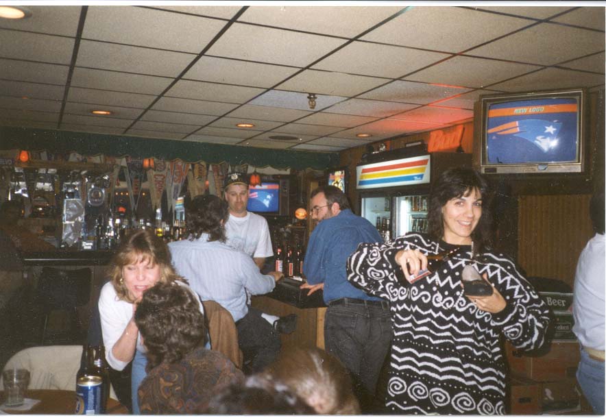 Andrea at the Hide-Away, pouring beer in her shoe. Hmmm... Andrea, is that YOUR shoe? Also, notice the television above Andrea's head. This was the first viewing of the new Patriot's logo. | |