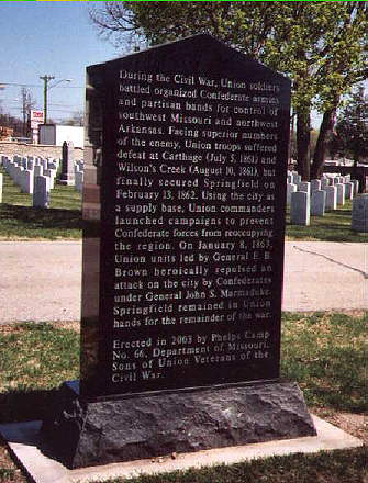 At the Springfield National Cemetery, on 10 April 2004, Phelps Camp members participated in the interment of remains of seven unknown soldiers, found at Wilson Creek National Battlefield. The remains were found in a sinkhole on the battlefield by archeologists in the 1960s, and were recently returned to the National Park Service for burial.