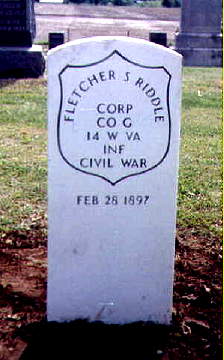 Broken gravestone of Fletcher S. Riddle, a veteran of Company G, 14th West Virginia Infantry, buried in the Barton City Cemetery near Iantha, Barton County, Missouri.