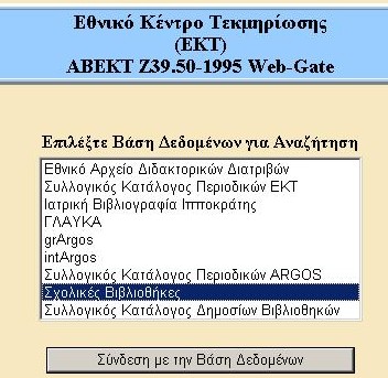 | Πληκτρολογήστε τη διεύθυνση: http://jasmin.ekt.gr/ και πατήστε enter. Στην οθόνη σας θα εμφανιστεί η διπλανή εικόνα. Επιλέξτε τη Βάση Δεδομένων "Σχολικές Βιβλιοθήκες" και πατήστε "Σύνδεση με τη Βάση Δεδομένων" Στην οθόνη σας θα εμφανιστεί μία σελίδα, μέρος της οποίας αποτελεί η κάτω εικόνα. |