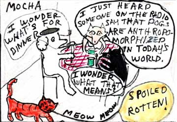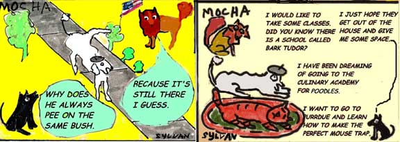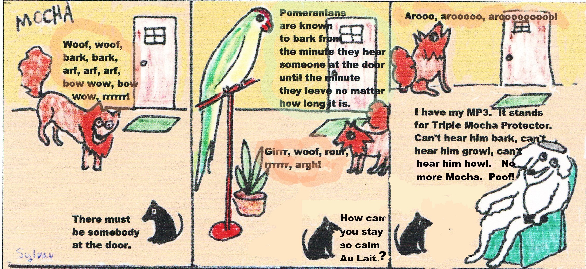 (Wally), a poodle, Expresso, a parrot and Oolong, (Red), a