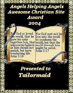 This award is for taking time to enhance the lives of others through your site and the prayer chain. It is a blessing to call you Sis and friend. From Big Sis To Tailormaid: For your excellence in spreading the Word of God and for starting our prayer chain and for being such a good influence on all of your warriors who love and thank God for you. We love you. God bless you and your family. Mamom This award is for your unconditional love For Bob and I and the many others you pray for, love and encourage. We love you and your sweet spirit. God Bless.... Bob And Sandy ![]() For people like you that love the Lord and do his work through the internet, I have made an award. I would like for you to be the first to recieve it. God be with you. Nail ![]() Thank you Teresa & Higgins! ![]() Anonymous ![]() Thank you Mr Chips and Lynnda ![]() Thank you Sharif and Lynnda ![]() I am honored to receive this and proud to be a "Florida Cracker"! Thank you! ![]() I am so honored to be a part of the "Southern Women"! Thank you! ![]() It's a privilege to be a "Steel Magnolia"! Thank you Mox! ![]() Thank you nail!