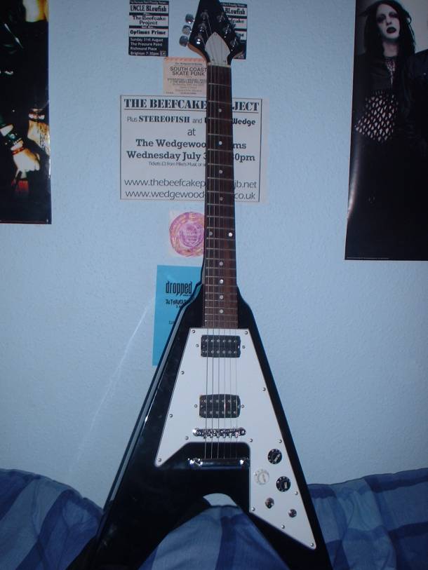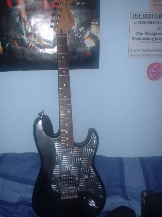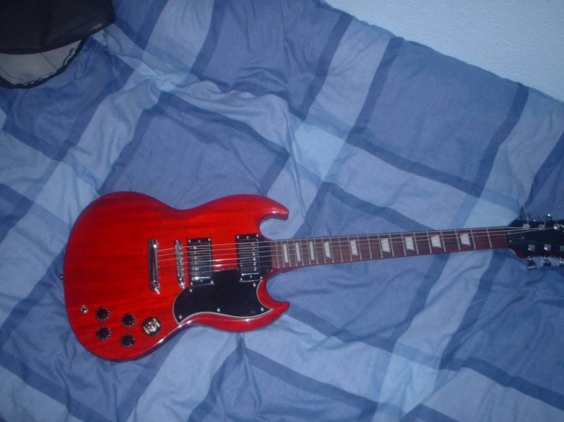 Customized: Sprayed black, new sheet metal scratch plate and Seymour Duncan 1959 reissue humbucker. This guitar i use for standard tuning songs, with Ernie Ball Skiny top heavy bottom strings (10-52)