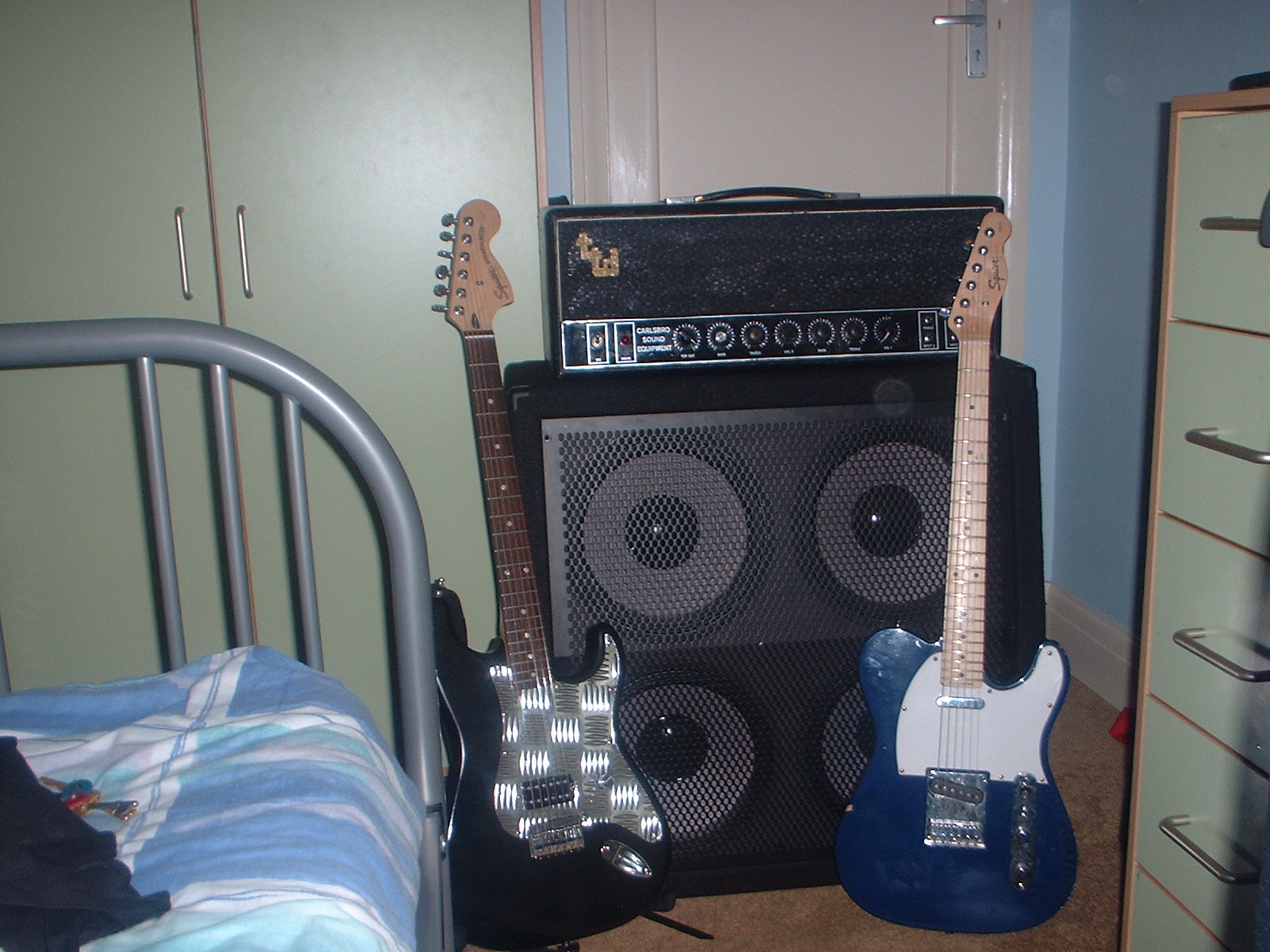 I use a Carlsbro 100watt all valve head and a carlsbro 300watt 4x12 Cabinet