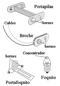 Materiales de la mini-linterna -Portapilas de dos elementos (se le llaama elemento a cada pila) con broche adaptador. -Broche que se adapta al portapilas conn cables. -Portafoquito de lata, pequeño a rosca.. -Foquito o lamparita a rosca de 2,2 Volltios, con cabeza concentradora (ésto significa que en su cabecita de vidrio posee una pequeña lupita que ayuda a concentrar la luz.). - Dos pilas tipo AA (1,5 voltios). |