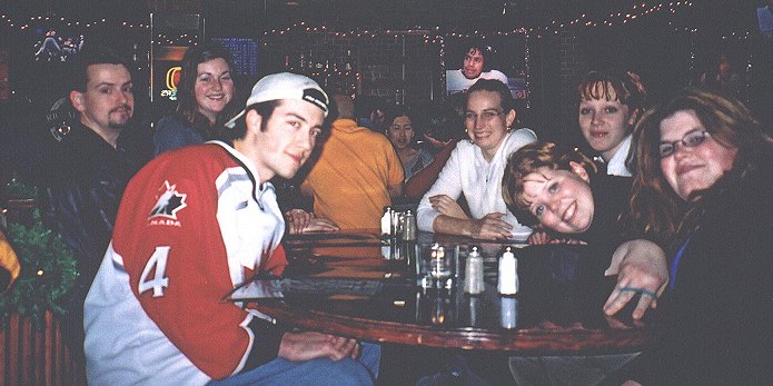 Taken at Mahoney's Sports Bar and Grill after the Canucks/Avalanche game. Left to right is an unimpressed Keith, smiley Rachel, sport nut me, Jessica, Holly down low, Christine and Leeanne.