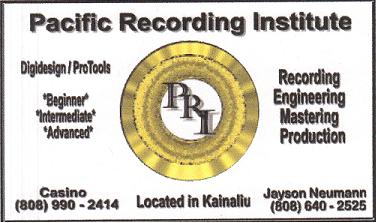 We also instruct students on "Artist Marketing" and Artist Web Marketing such as setting up your web site for your act on places like: www.MySpace.com www.ISound.com www.Soundclick.com and others where you can upload your music for review and downloads that will generate artist royalties and allow your music to be seen and heard by the music industry executives that may sign your act to label agreements and performing opportunities. Enroll in the two part course at Pacific Recording Institute! Learn how to be a PROFESSIONAL in a small class structure on modern equipment, taught by seasoned professional producers. We teach you how to compete in the competitive Music Industry! Short Course: $595 - Extended Masters Course: $995 Contact Casino or Jayson for Details at: 808.960.1187 or Mark Wood, Marketing Director at 808.989.9839 or 661.480.3757 and BigIslandReporter@Yahoo.com http://www.oocities.org/thebigislandreporter/ E-mail Casino at c.copublisherbir@yahoo.com |