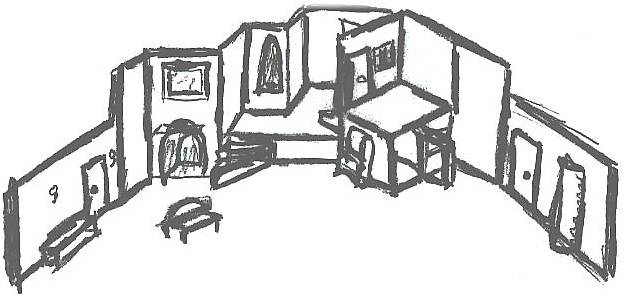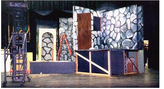 | This design was my first attempt at scenic design. I had been intrigued by the idea of creating my own design so I found myself reading this script looking for clues and mentally visualizing the show in the completed form. Slowly walls formed, doors opened, and I started to realize what the castle would look like. I had a few different versions of the design and one of the best aspects of it happened at the last minute on stage while under construction. I had had some problems with sight lines in the upstairs room. So out of frustration we pushed the entire unit at an angle to meet the lines. It worked. In fact it looked great, it added a lot of depth and a great perspective/angle to my design. |