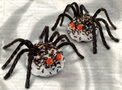 Insert licorice pieces into tops of cupcakes to create spider legs.